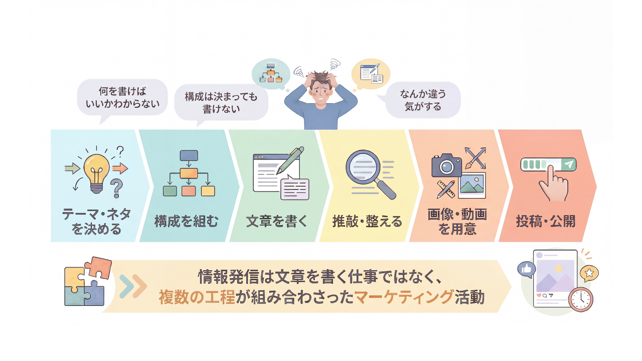 情報発信は文章を書く仕事ではなく、複数の工程が組み合わさったマーケティング活動です。毎回ゼロから全部取り組もうとすると、それだけで相当な時間と労力がかかります。発信が続かない一番の原因は意志の弱さではなく、この工程の多さにあることがほとんどです。