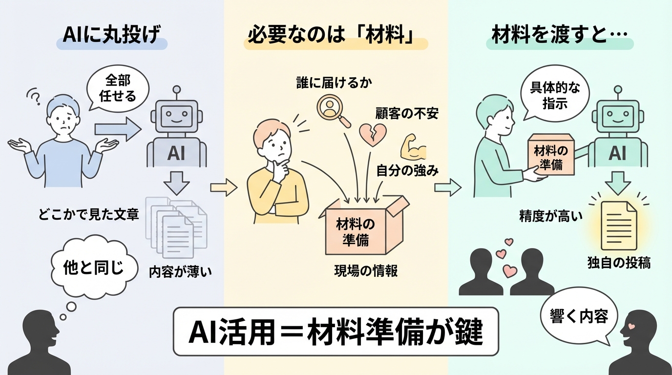 方向性が決まっていないままAIを使うと、どこかで見たことのある文章ができあがります。内容が薄く、印象に残らない。読んでいるお客様には「この人の発信、なんか他と同じだな」と感じさせてしまいます。それはAIの精度の問題ではなく、AIに渡す材料の準備ができていないことが原因です。