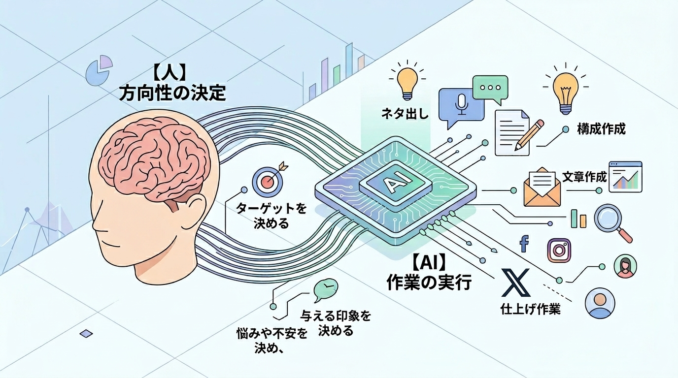AIが削減してくれるのは操作の手間ではありません。何を書こう、どう始めようと迷い続ける時間です。ここが短くなるだけで、投稿1本にかかる時間は大きく変わります。